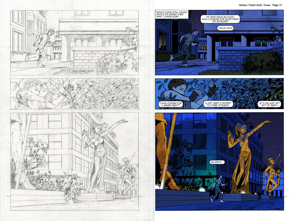 Hey everyone! So you now have the first glimpse into the world of “Hollow”! Below is page 17, where we find Noz running from those who hunt him. His memory has been tampered with, keeping him off-balance, as he races through the streets of his once familiar home city.